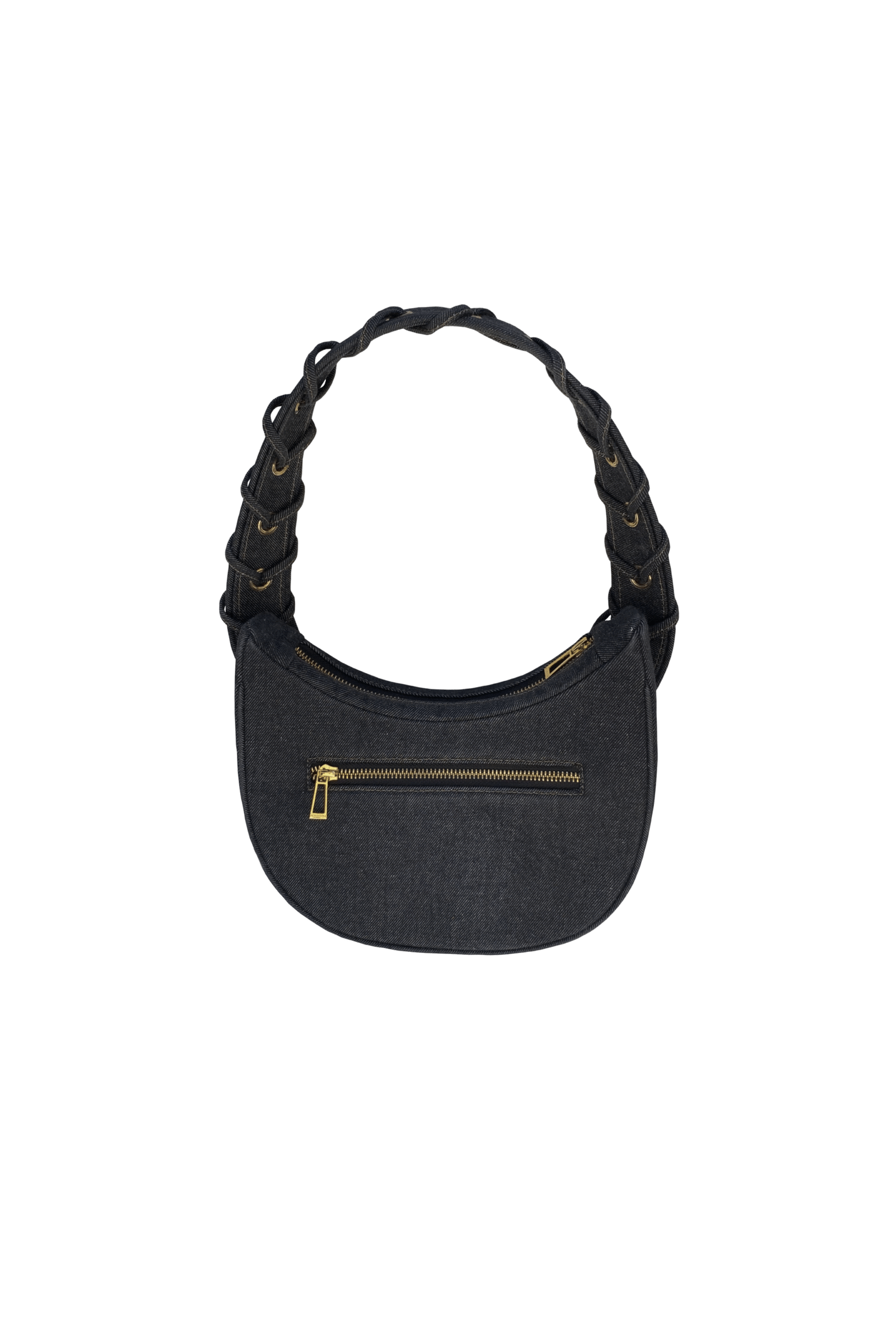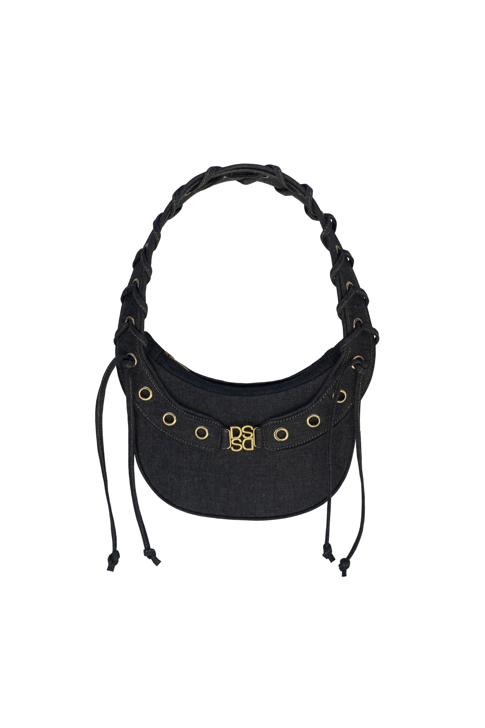 Bolso media luna con nuestra icónica asa deconstruida, cierre superior con cremallera y detalle de hebilla DS en delantero. Detalles de ojales y tiras entrelazadas en asa, elementos claves de la marca. Elaborada en 100% denim suprarreciclado de piezas denim vintage.