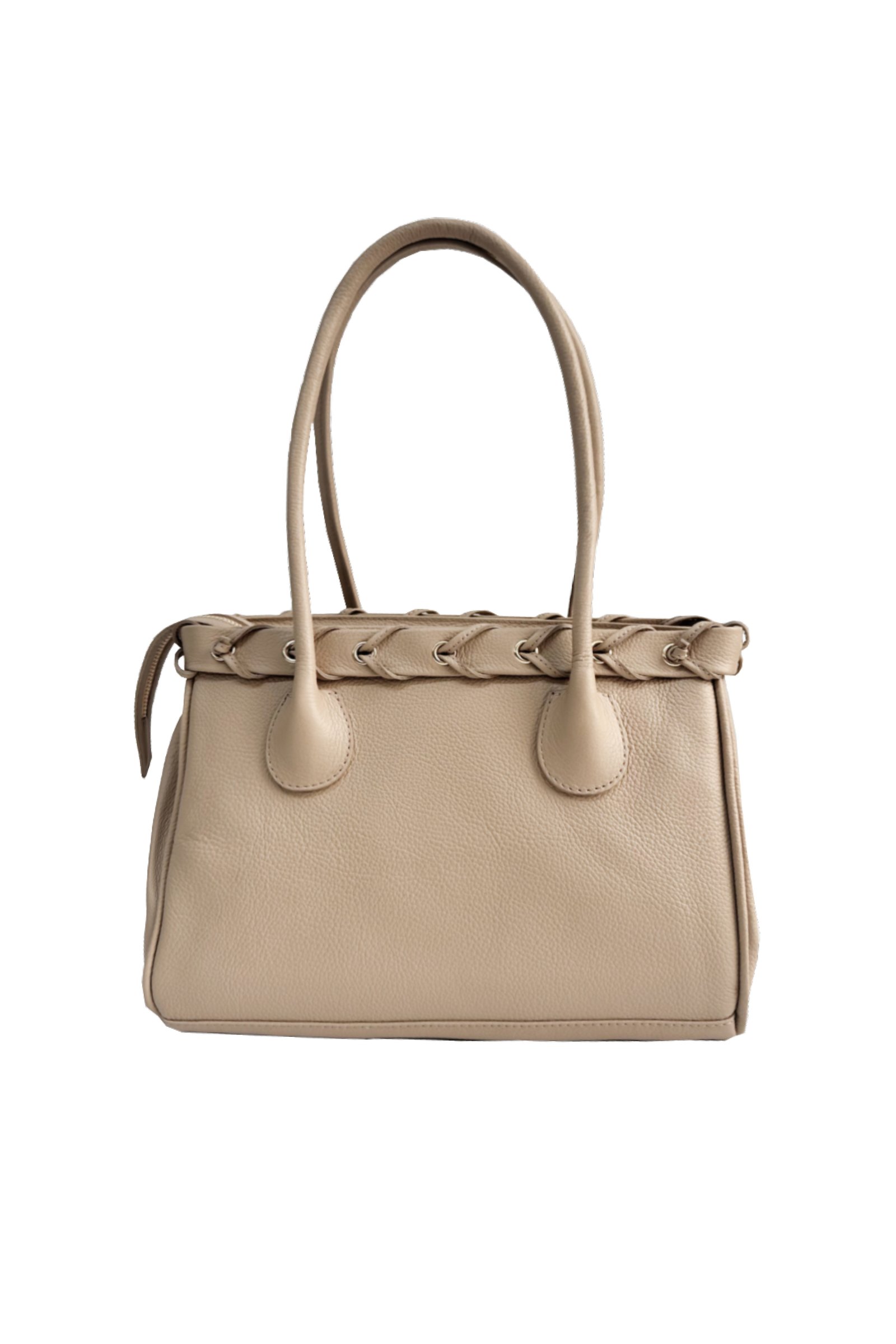 Bolso de hombro de doble asa. Detalle de correa con ojales y tiras. Bolsillo interior con cremallera. Cierre mediante cremallera con tirador. Elaborado en 100% cuero vacuno recuperado de la industria ganadera.